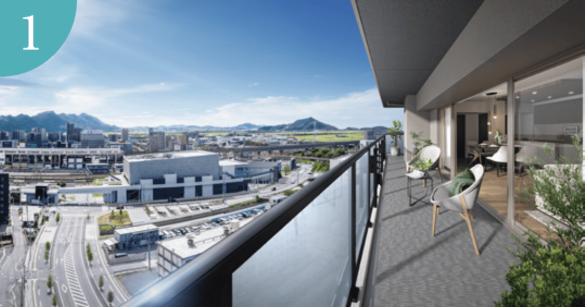 左右に大きく開くセンターオープンサッシを採用する事で、開放感とバルコニーとの一体感が得られ、採光性も高めました。