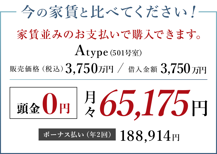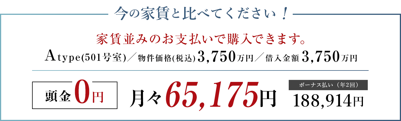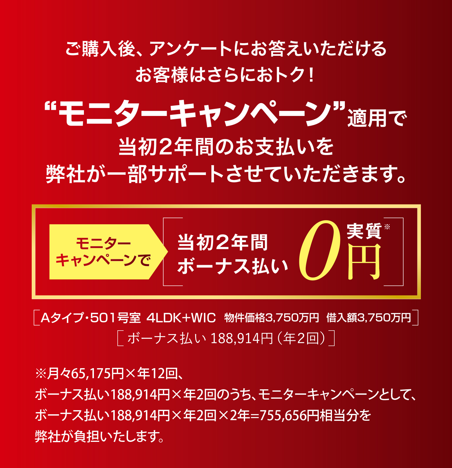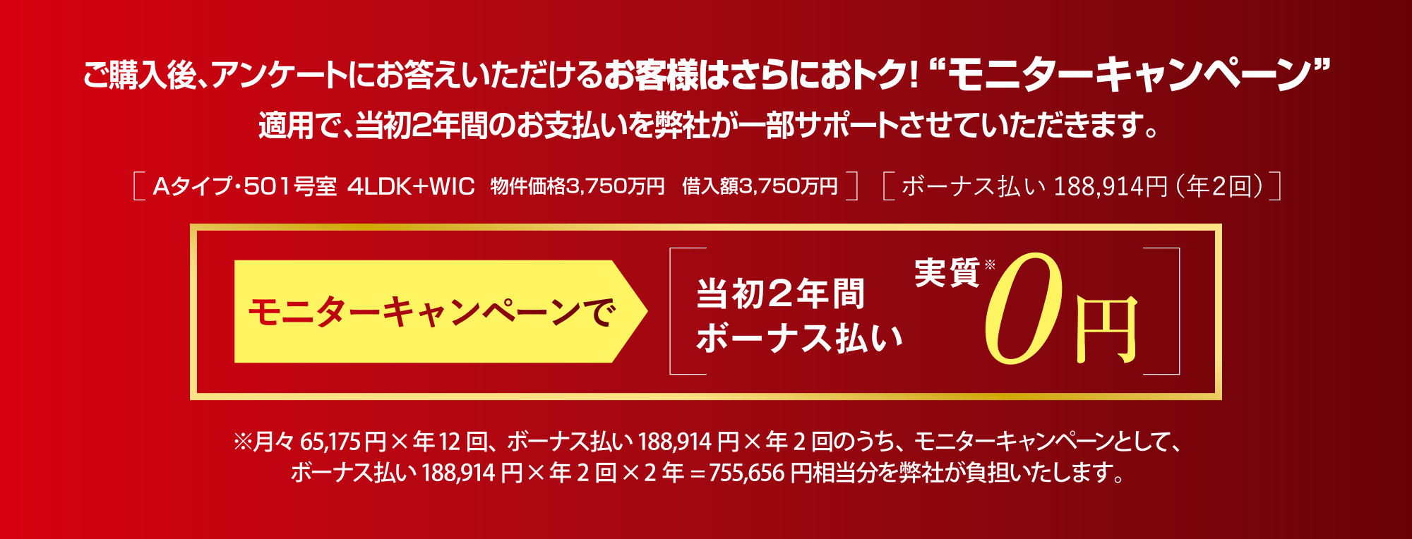 - ※月々65,175円×年12回、ボーナス払い188,914円×年2回のうち、モニターキャンペーンとして、ボーナス払い188,914円×年2回×2年=755,656円相当分を弊社が負担いたします。